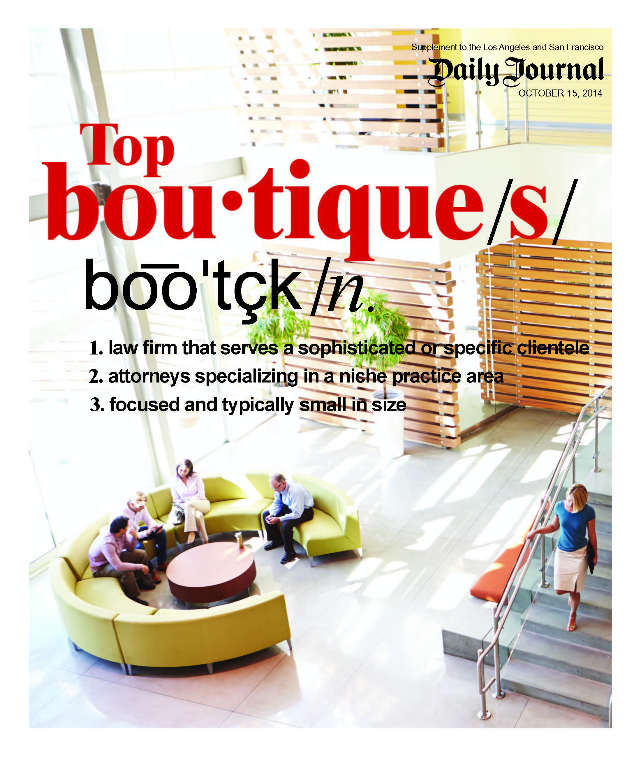 Our goal with this inaugural issue devoted to legal boutiques was to honor firms that truly embody the meaning: do one thing and do it exceptionally well. We talked to lawyers around the state about the firms they thought stand out. It wasn't long before the cream rose to the top. In conversation after conversation, the same names were mentioned. While this survey is by no means scientific, it gives readers a good idea of who are regarded by their peers as the marquee boutiques.